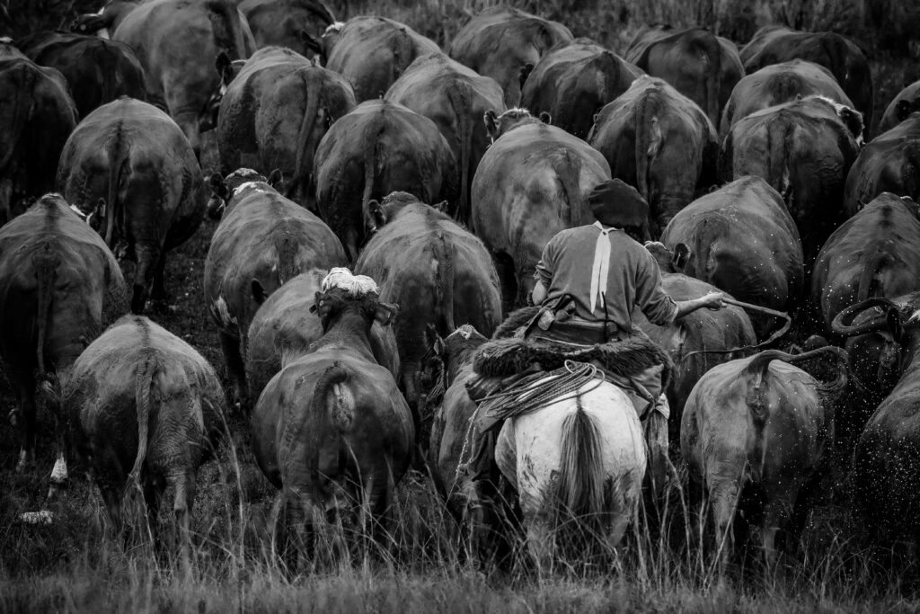 Estas fotografías nacen ahí, entre las vacas, la gente que las trabaja y sus montados. No se arman: suceden. Mientras el trabajo avanza y los animales se mueven, el tiempo marca su propio ritmo. Hay espera y hay precisión: un animal bien parado, una tropa en marcha, un caballo suelto, una mirada que dura lo justo.